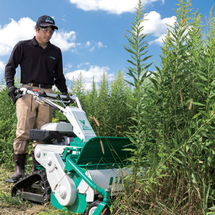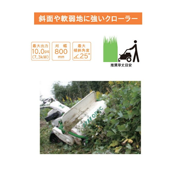 刈幅800mmの10馬力仕様。クローラー搭載で軟弱地でも安定した草刈が可能