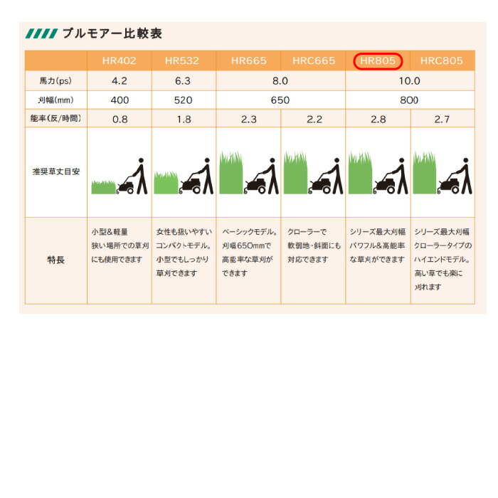 刈幅(mm)800/刈高(mm)20〜85(無段階)/ハンマーナイフ×46枚