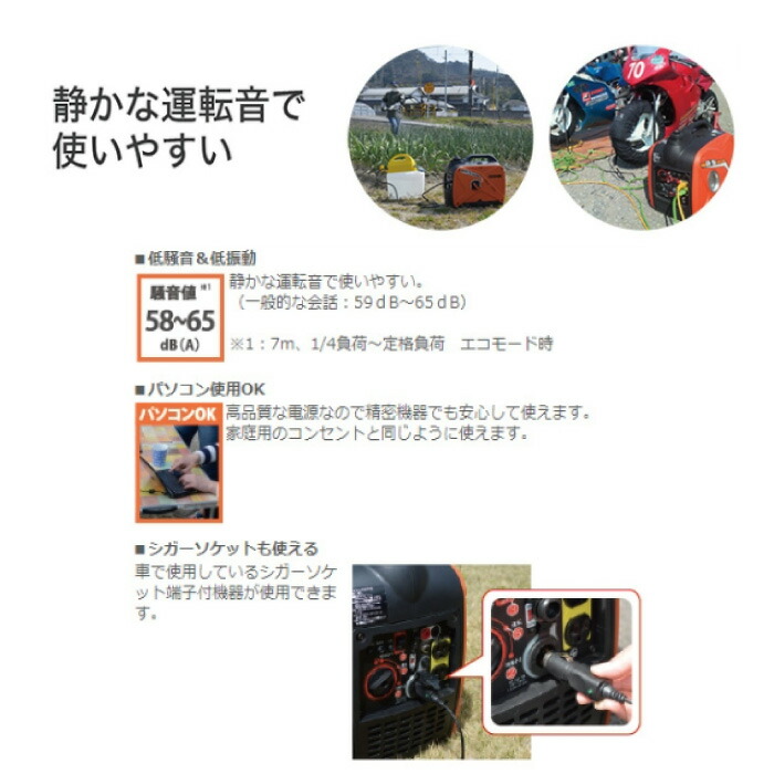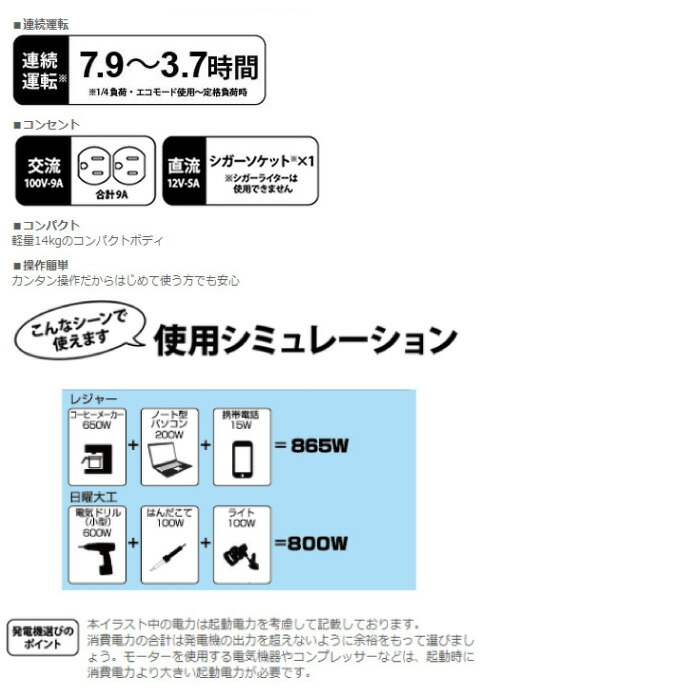 ・水中ポンプなどのモーターを使う電気機器は、動き始めに大きな電力(起動電力)が必要なので、消費電力(W)の3~5倍の出力(VA)の発電機が必要です。 ・ホコリの多いところでは使用しないで下さい。