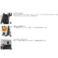 便利な機能満載のコンパクト高圧洗浄機。アルミ製移動用ハンドル、直径が大きいホイール、7 mの繊維メッシュ補強高圧ホース、スプレイヤーホルダー、アルミ製伸縮ハンドル、アクセサリーホルダー、フロントカバー下のノズル収納トランク、高圧ホース取付クイックリリースカップリング付き。