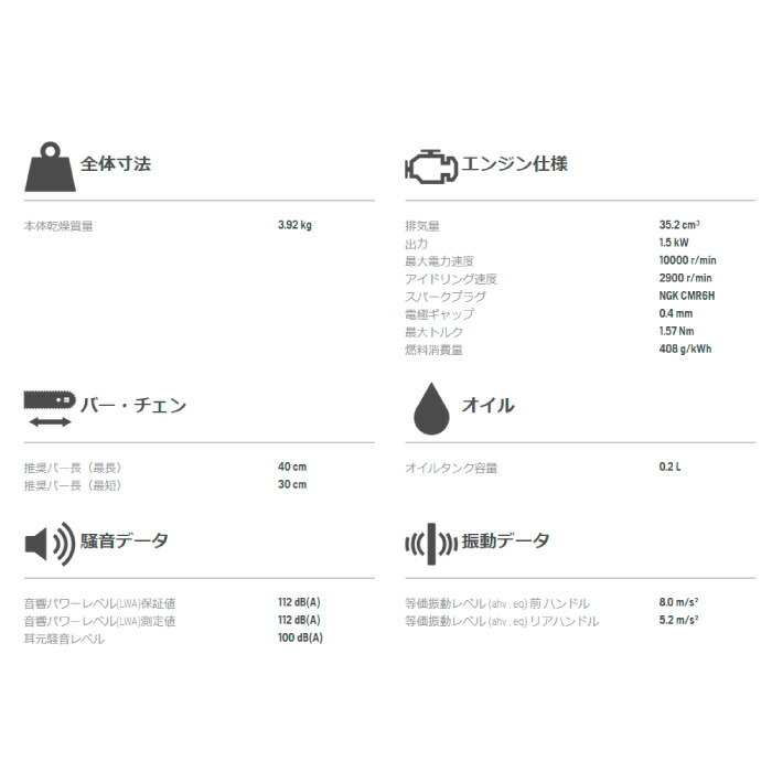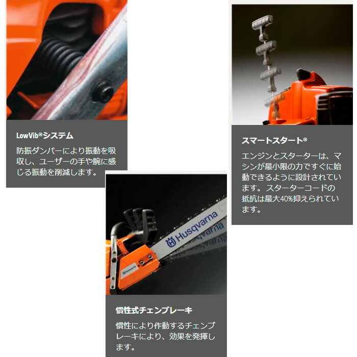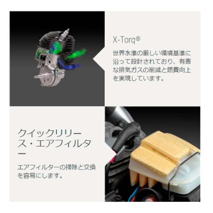 比較的簡単なチェンソー作業を行う農家や一般ユーザーのために開発され、とても使い勝手がよく、軽量でコンパクトなチェンソーです。X-Torq®エンジンを搭載し、環境に優しく低燃費です。また、スマートスタート®、燃料ポンプとオートリターン・ストップ・スイッチにより、簡単に始動できます。