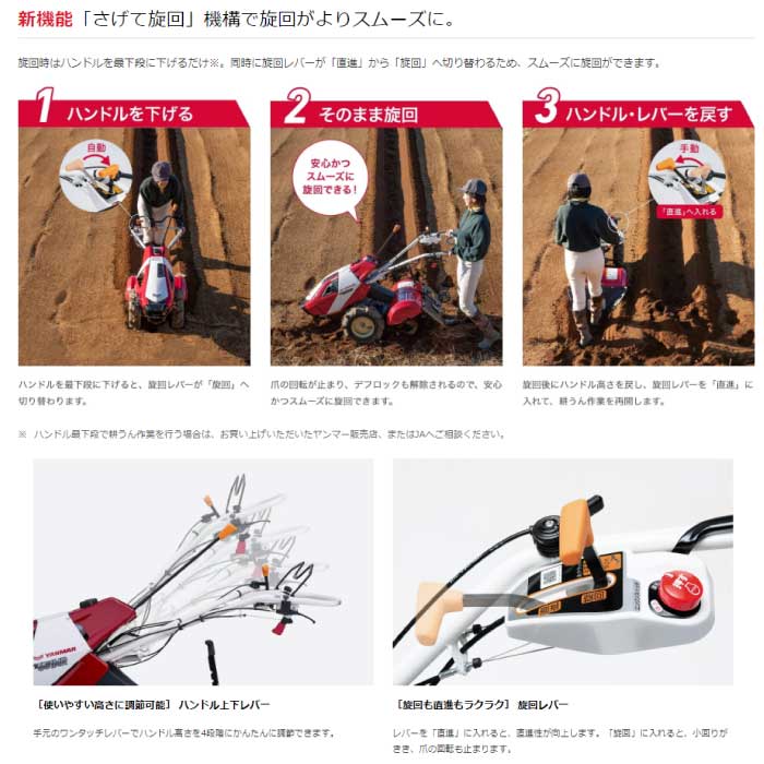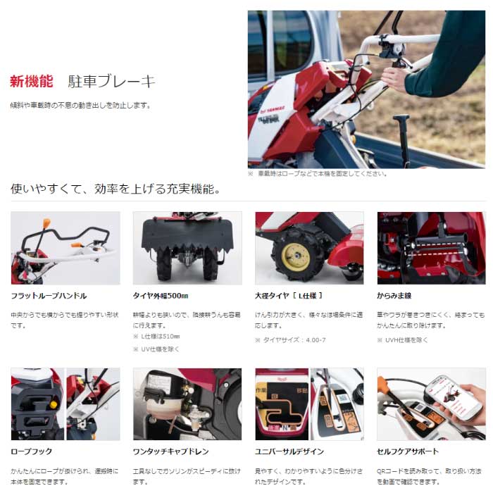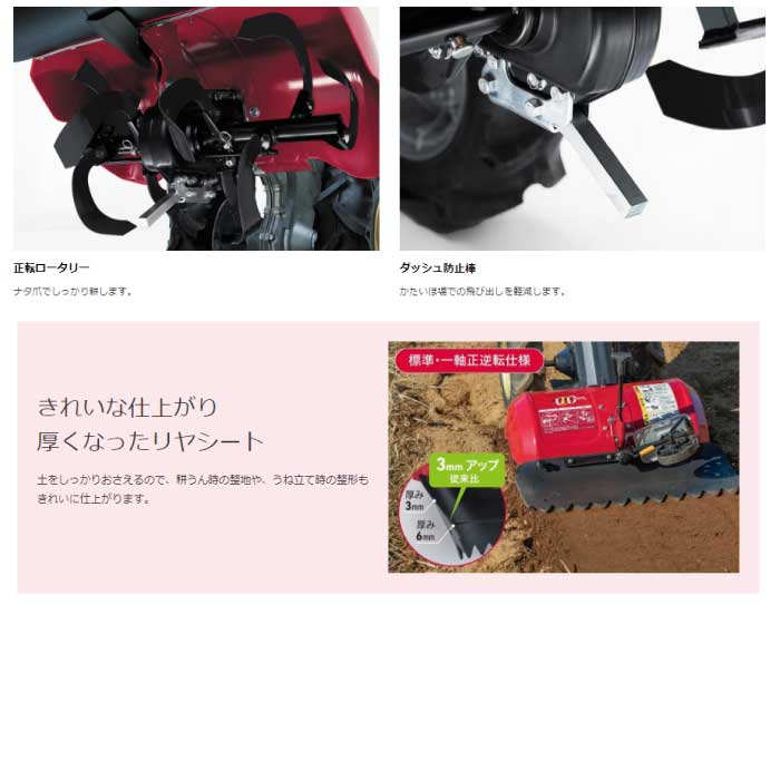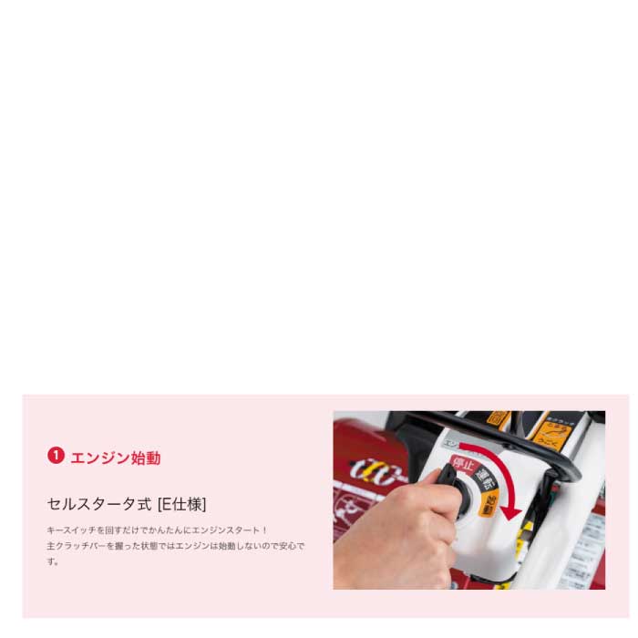 耕うん・うね立ての基本を備えた標準タイプ。黒ボク土や砂土・砂壌土など、比較的やわらかい畑に。セルスターター式で始動しやすい!