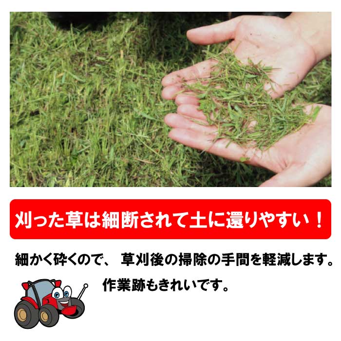 すみっこまで思いのまま! カンタン操作でラクラク草刈り!! 軽量・コンパクトで操作もかんたん、リーズナブル。 さまざまな場所で使えて、草刈りが楽になるコンパクトハンマーモア! 【仕様】 機体寸法 ・全長(mm)1230 ・全幅(mm)560 ・全高(mm)1070 機体質量(重量)(kg)66 エンジン ・型式名 三菱GB101 ・種類空冷4サイクルガソリンエンジン ・総排気量(L{cc})0.098{98} ・定格出力/回転速度(kW{PS}/rpm)1.6{2.2}/1800 ・最大出力(kW{PS})2.2{3.0} ・エアクリーナー乾式 ・使用燃料 自動車用無鉛ガソリン ・燃料タンク容量(L)1.6 ・始動方式リコイルスタータ式 走行部 ・車輪 前輪(ゲージ輪)プラスチックタイヤ 後輪3.50-6 ・変速段数 (段) 前進2・後進1 ・走行速度 F1(作業)(km/h{m/s})1.1{0.3} F2(移動)(km/h{m/s})3.6{1.0} R1(後進)(km/h{m/s})1.45{0.4} ・最大傾斜角度(度)10※1(法面) ・走行クラッチデッドマンクラッチ機構 ・旋回方式簡易旋回機構※2 ハンドル 左右調節ループ式(左右振りなし) 上下調節(段)3(ワンタッチ可変式) ロータリー部 ・刈幅(mm) 450 ・刈高さ(mm)20~55(6段階調節) ・ナイフ枚数(枚) 24 ・適応草丈(mm) ~600 ・作業能率(a/時間) 5 ※1最大傾斜角度は法面の状態によって異なります。 ※2タイヤ外幅341mmにセットしている場合は、簡易旋回機構の使用はできません。 ※諸元は改良などにより予告なく変更することがあります。 【注意】 ・燃料やオイル等は入っていません。 給油はお客様自身でのご対応になります。※商品組立も含む。 【配送上の注意事項】 製品は最寄りの佐川急便の営業所受取となります。 ※お荷物のお渡し可能時間は営業所により異なります。 詳しくは営業所検索で、担当営業所の「荷物の受け取り可能時間」をご覧ください。 下記の場所は配送不可となります。 北海道、沖縄県、離島 荷下ろしには運搬用具が必要です。 (軽トラ、フォークリストなど)