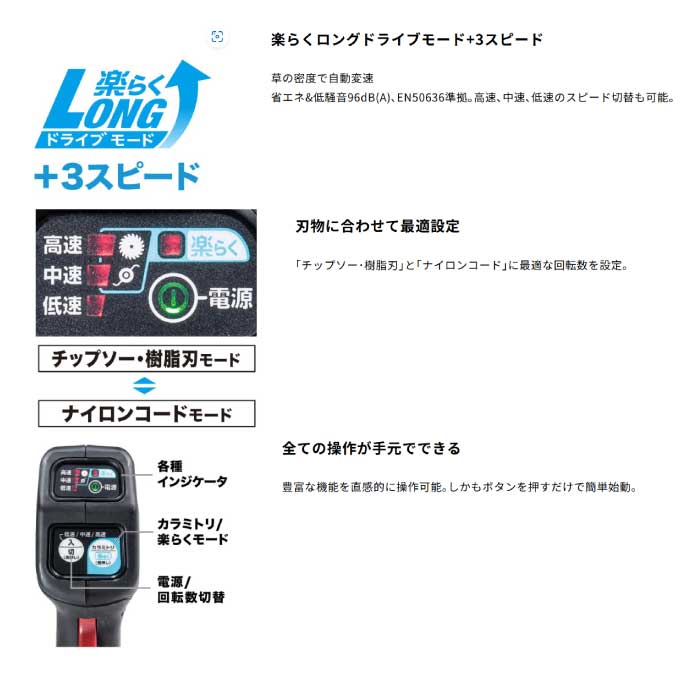 ハイパワー、低騒音96dB(A)&低振動、 30mLエンジン式と同等の使用感