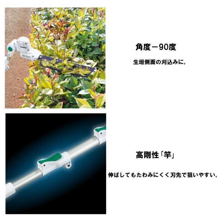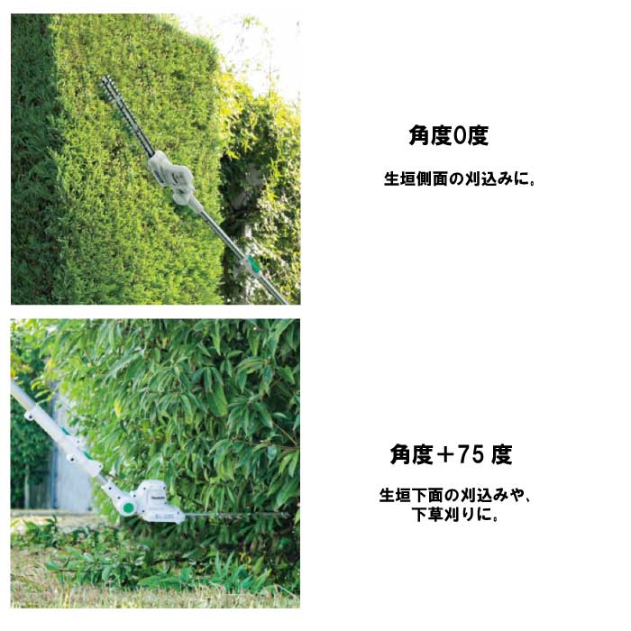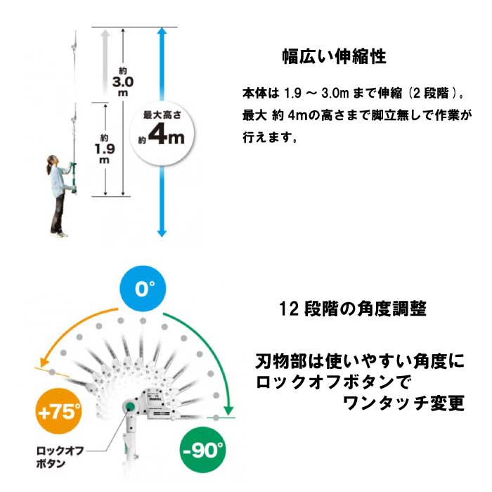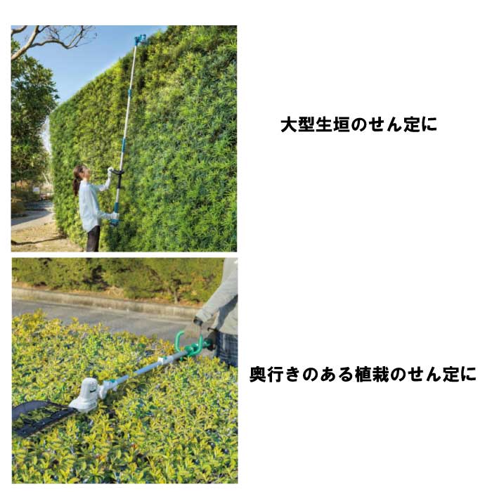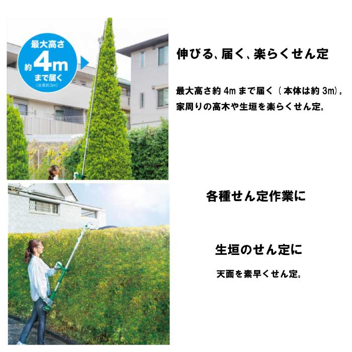 最大高さ約4mまで届く(本体約3m) 家周りの高木や生垣を楽らくせん定< 【仕様】 ・刃物長(mm):300 ・ストローク数(min-1)[往復/分]:1,800 ・カット数(min-1)[回/分]:3,600 ・電源(V):直流18 ・充電連続運転時間(無負荷時/目安):3.0Ah:約1時間20分 ※1充電連続運転時間[作業量]の補足:数値は参考値です。バッテリの充電状態や作業条件により異なります。 ・本機寸法(mm):長さ 1,887〜3,011/幅 172/高さ 192 ・質量(kg):3.3 ※質量の補足 バッテリ含む ・標準付属品:チップレシーバ/ブレードカバー/バッテリBL1830B(3.0Ah)×1本/充電器DC18WC×1台 ・機能:防じん・防水 APT 取扱説明書に沿ってご準備をお願い致します。