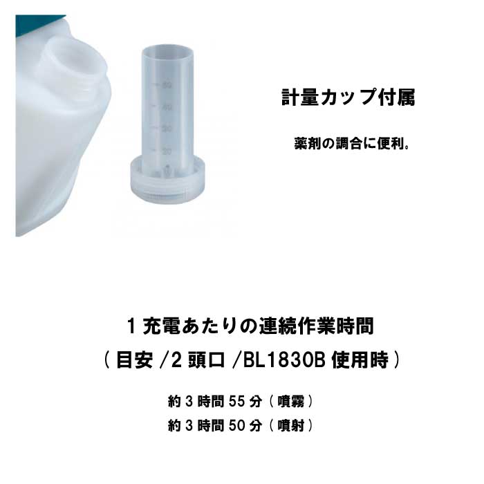 ・1充電連続運転時間(目安):3.0Ah 噴霧 1頭口:約4時間 2頭口:約3時間55分/噴射 1頭口:約3時間55分 2頭口:約3時間50分