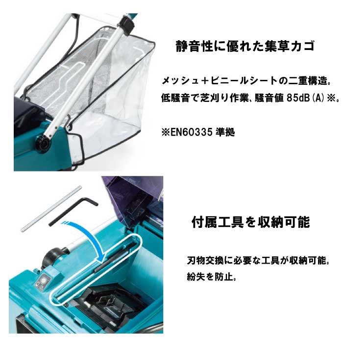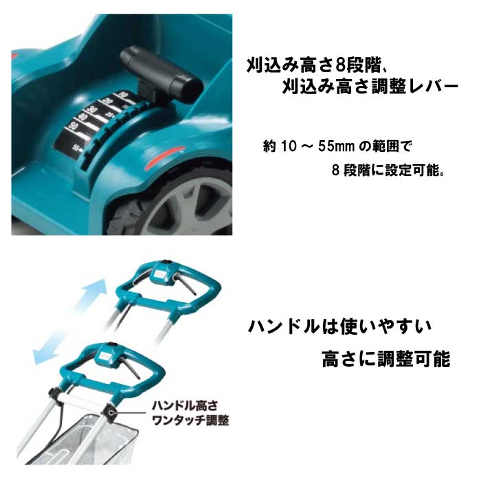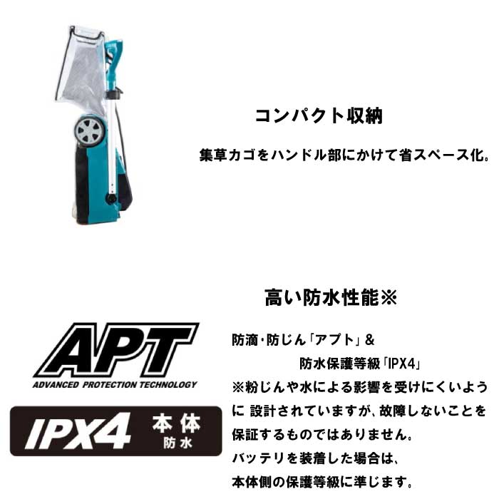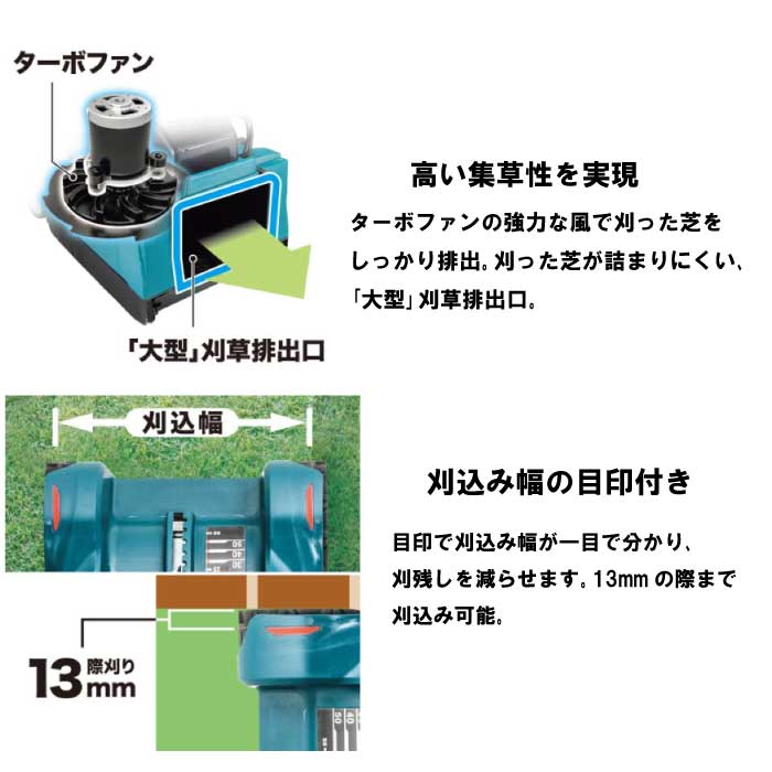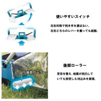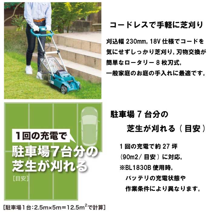 【仕様】 コードレスで手軽に芝刈り。刈込幅230mm 18Vタイプ登場! 【仕様】 ・刈込幅(mm) :230 ・回転数(min-1)[回転/分]:7,000 ・電源(V):直流18 ・1充電連続運転時間(目安) 3.0Ah:約6分 ・1充電作業量(目安) 3.0Ah:約27坪[約90m2] ※1充電連続運転時間[作業量]の補足:数値は参考値です。バッテリの充電状態や作業条件により異なります。 ・本機寸法(mm):長さ 860~1,105(収納時:264)/幅 256(収納時:363)/高さ 680~920(収納時:780) ※本機寸法の補足 ※収納時は集草カゴ含まず。 ・質量(kg) 8.2 ※質量の補足 ※集草カゴ含まず。 ・標準付属品 :六角棒スパナ5/ロックピン ・機能 防じん・防水 APT IPX4 取扱説明書に沿ってご準備をお願い致します。
